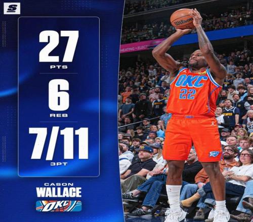 卡森华莱士成为本场雷霆最大奇兵,全场14中9,三分11中7,拿了27分6篮板2抢断,单场27分、7记三分均为华莱士赛季最高(此前最高是17分、5记三分)。